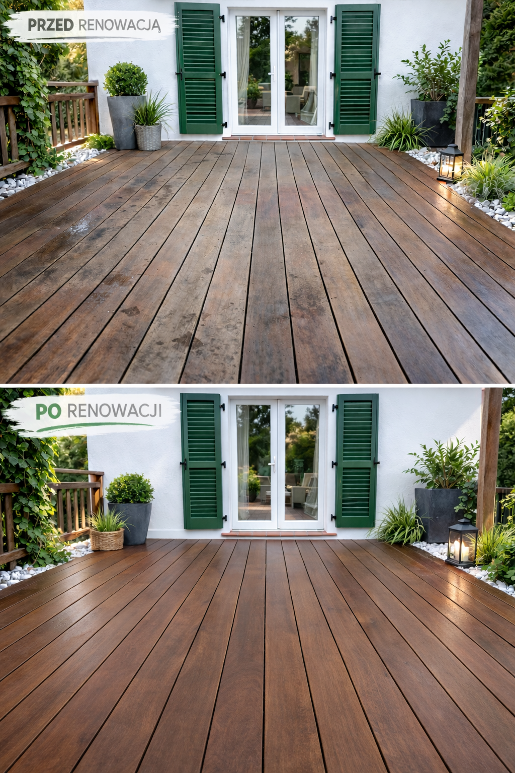 Po aplikacji drewno ciemnieje do bogatego, matowego koloru, a następnie stopniowo jaśnieje w zależności od nasłonecznienia. To naturalny wskaźnik, kiedy wykonać pielęgnację.